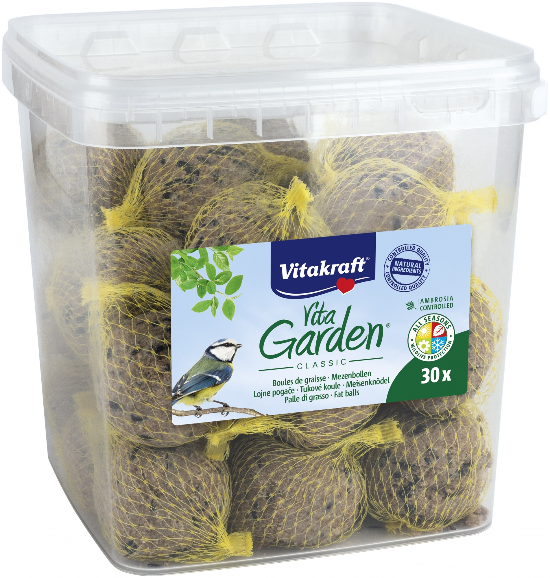 Vita Garden výrobky jsou určeny pro celoroční krmení zahradního ptactva. Obsahují základní živiny a důležité vitamíny. Bez přídavku umělých barviv či konzervačních látek.