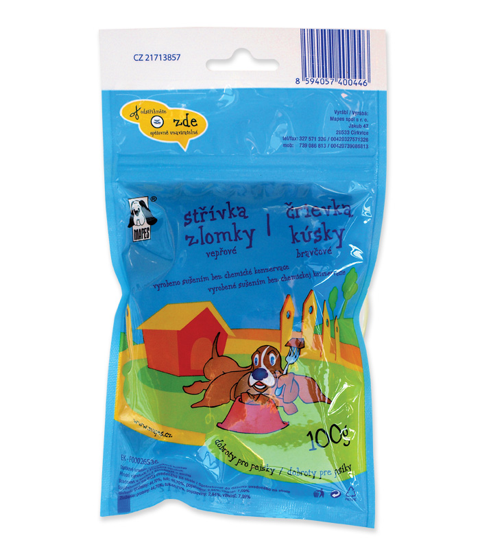 Vepřová střívka nejsou šlemovaná a suší se velmi šetrně, aby zůstala vláčná a aby si zachovala mikroflóru, která má blahodárné účinky na zažívací systém psů. Pro psy jsou zvlášť lákavou pochoutkou. Zlomky jsou upraveny pro menší plemena.