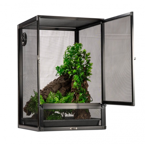 Velké otevírací přední dveře umožňují plný přístup do vnitřku terária. Vyjímatelný plastový šuplík na substrát vám umožňuje snadnou manipulaci se substrátem, který zároveň zvyšuje vlhkost. Šuplík lze snadno vyjmout z terária skrz otevírací spodní dveře.