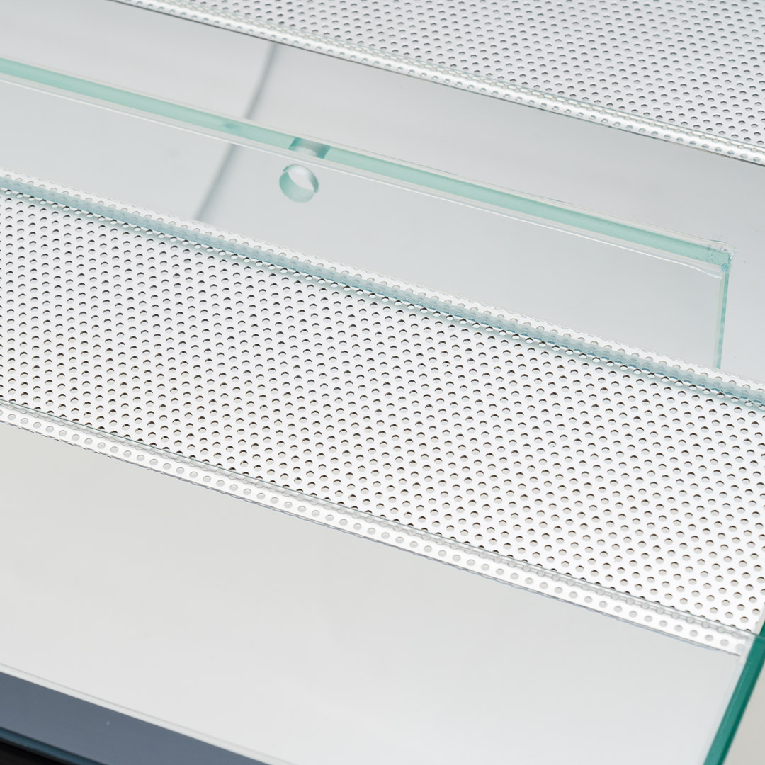 - Skleněná podélná výztuha, která je nalepená uvnitř terária na stropě, zaručuje pevnost i předního dílu stropu. A zároveň 2 otvory o průměru 10 mm ve výztuze mohou posloužit jako úchyt pro tepelný zdroj.